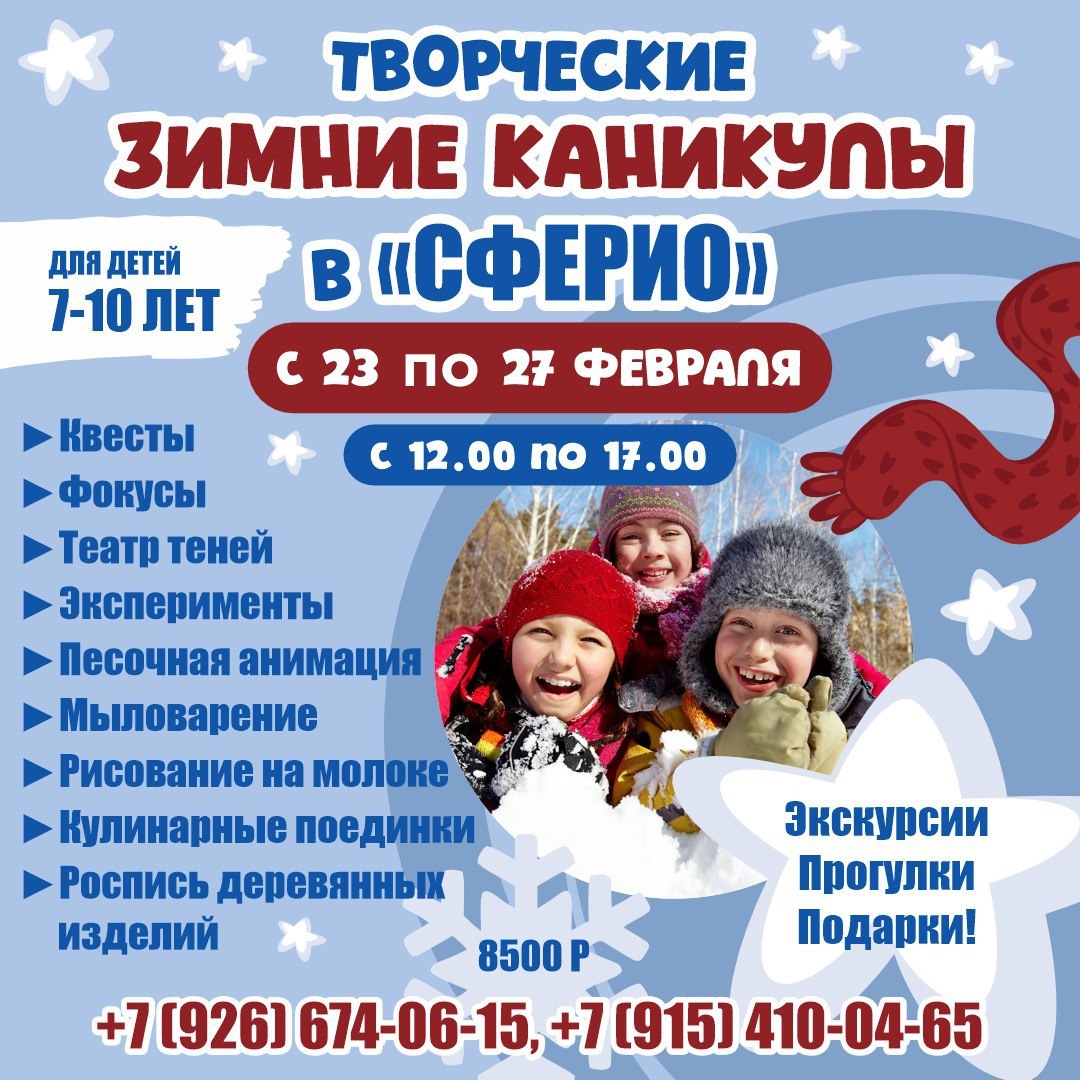 ! Вас ждут:🔬 Эксперименты 🎩 Фокусы 🍳 Кулинарные поединки 🖼️ Песочная анимация 🎨 Мыловарение 🏃 Квесты, настольные игры Экскурсии, прогулки,подарки! 🎁 🏢 Учебный центр "Сферио" 📍 г. Чехов,ул. Полиграфистов, 6 (Вход со двора, подъезд 2, этаж 3) 🔗 Записаться: https://t.me/Sferio_Chekhov Наши соцсети 📲⬇️ ➡️ ВК https://vk.com/sferio_kids ➡️ ТГ https://dzen.ru/id/672e115c65592e5989376c34 ➡️ Продленка https://vk.com/prodlenkachehov ➡️ Школа https://vk.com/sferio_school 🎁Забрать подарок:🎁 https://t.me/bot_sferio_bot ⭐Поддержать канал голосом #СфериоКаникулы #ЗимниеКаникулыЧехов #детскийлагерьЧехов #каникулыдлядетей #досугдетей #творчество #эксперименты #кулинария #мыловарение ✅ Мероприятия Чехов https://dzen.ru/id/66cc4b48e9ef144699238a51 http://vk.com/chekhov_events http://dzen.ru/chekhov_events