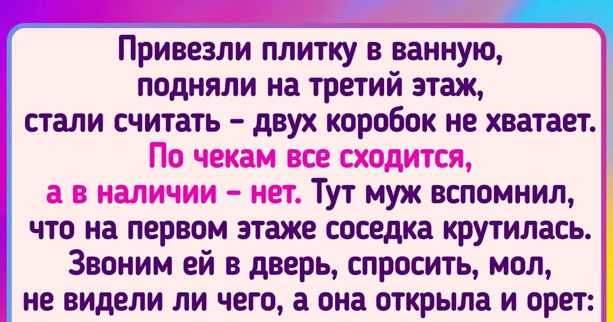 “Привезли плитку, начали считать — двух коробок не хватает. Соседка с первого этажа призналась, что забрала ее в компенсацию за шум и пыль. Со скандалом вернули, до сих пор в шоке, как она утащила эти коробки.”