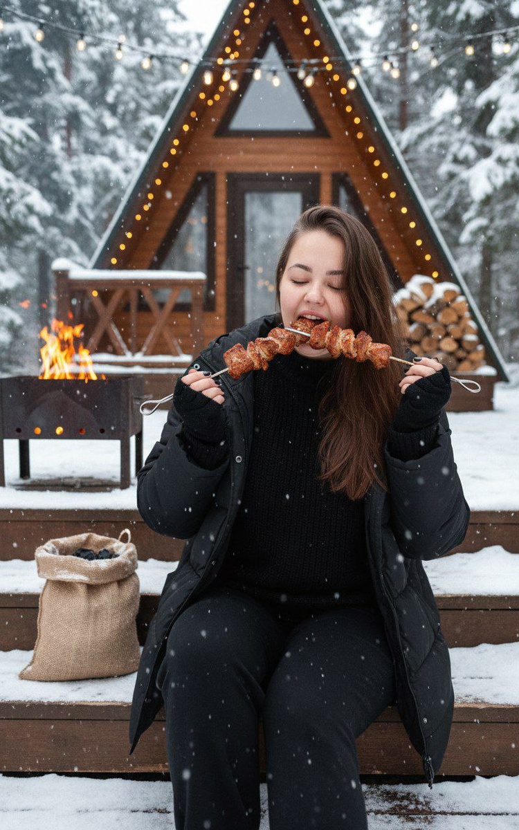 😀Выбираем "нейросети" 😀Нажимаем "Nano Banana" 😀Нажимаем "Nano Banana Pro" 😀Прикрепляем через скрепку свое фото и выбранный промпт 😀Наслаждаемся результатом😍 Создай ультрареалистичное Ии фото лицо девушки, где девушка сидит на деревянных ступеньках на снегу, на заднем плане - хижина деревянная в стиле A-frame и деревья снежные, над ней от дома натянута гирлянда. У девушки длинные блестящие волосы один локон падает на лицо Она в чёрном свитере сверху на плечи накинута чёрная дутая зимняя куртка матовая кинематографический стиль, легкая зернистость. Она кусает шашлык на шампуре Держит шампур с шашлыком двумя руками с двух сторон Шашлыка много на шампуре На фоне мангал горит огонь рядом с мангалом стоит небольшой мешок с углем Дальше поленница дров Не меняй черты лица Она с закрытыми глазами Ногти чёрные короткие Ресницы пышные Идёт легкий снег Она откусывает шашлык #женские@annapromtii20 #зимние@annapromtii20