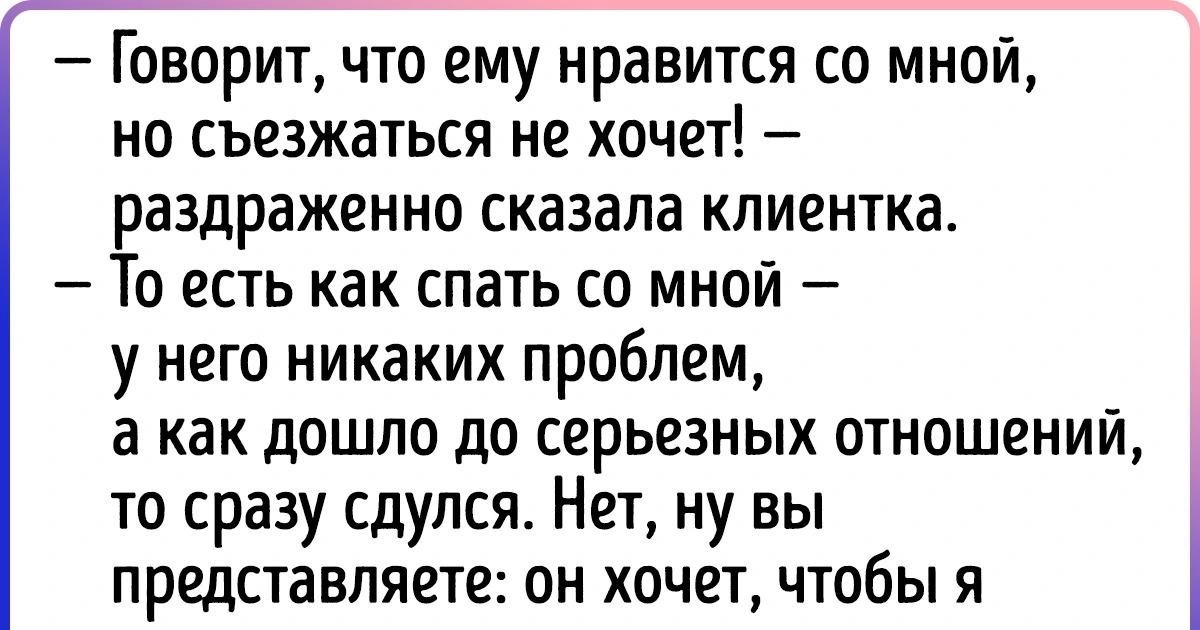“Супружеская пара пришла на прием, но разговор быстро перешел в скандал. Женщина в ярости сняла кольцо, швырнула его в мужа и выбежала, хлопнув дверью. Мужчина посидел молча, потом вздохнул и с облегчением сказал, что теперь наконец сможет пройти третьего Ведьмака или зависнуть с друзьями в Доте.”
