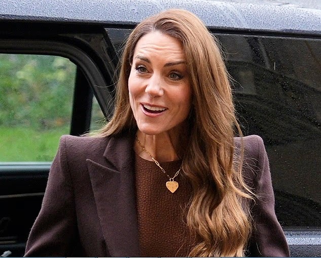 Во время этой встречи Принцесса Кэтрин была одета в изготовленное на заказ коричневое фактурное миди-платье от Edeline Lee и длинное коричневое пальто от дизайнера Catherine Walker: