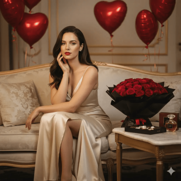 ОБЯЗАТЕЛЬНОЕ ТРЕБОВАНИЕ: СОХРАНЕНИЕ ВНЕШНОСТИ [ИСПОЛЬЗОВАТЬ ЗАГРУЖЕННОЕ ФОТО В КАЧЕСТВЕ РЕФЕРЕНСА ЛИЦА] Строго следовать чертам лица с референсного изображения Не изменять черты лица Максимально точно сохранить идентичность и сходство с оригиналом Перенести все уникальные особенности внешности с загруженных фотографий ОСНОВНАЯ КОМПОЗИЦИЯ Элегантный романтический портрет в стиле lifestyle-фотографии. Модель грациозно сидит на светлом диване в изысканной, интимной обстановке. ОДЕЖДА И СТИЛЬ Длинное облегающее вечернее платье с глянцевой текстурой. Цветовая палитра: мягкие шампанские оттенки. Утончённый разрез на ноге, добавляющий элегантную чувственность без преувеличения. Ткань деликатно отражает свет, подчёркивая роскошь и текучесть материала. ВОЛОСЫ Глянцевые, здоровый блеск, шелковистая текстура. Стиль укладки как в рекламе Pantene — идеальное отражение света на волосах. Безупречная укладка: гладкая, отполированная манера. МАКИЯЖ Гламурный и тщательно выполненный: Сияющая кожа с естественным свечением Мягкий румянец на щеках Выразительные глаза: точная подводка, длинные ресницы Смелые красные губы, перекликающиеся с романтическими акцентами сцены ПОЗА И ЖЕСТЫ Одна рука изящно касается лица — утончённый, элегантный жест. Расслабленная, естественная поза. Уверенная и спокойная манера держаться. РЕКВИЗИТ И ДЕТАЛИ Основной визуальный акцент: Большой букет насыщенных красных роз, завёрнутых в матовую чёрную бумагу. Дополнительные элементы: Несколько красных воздушных шаров в форме сердец на заднем плане Элегантный журнальный столик рядом с диваном Роскошная коробка шоколада на столике Изящный флакон парфюма Общая атмосфера: высококлассная романтика в стиле Дня Святого Валентина. ОСВЕЩЕНИЕ Мягкий, тёплый рассеянный свет, заполняющий пространство. Интимная и отполированная атмосфера. Блики деликатно подчёркивают блеск платья и букета. Мягкие тени скульптурируют черты лица и сохраняют глубину изображения. НАСТРОЕНИЕ Романтичное, роскошное, редакционное. Спокойное, уверенное, красиво скомпонованное. ТЕХНИЧЕСКИЕ ПАРАМЕТРЫ Съёмка: 35мм плёнка, Kodak Portra 400 Камера: Sony A7R IV Объектив: 50mm f/1.2 Освещение: кинематографический мягкий свет в стиле Adelin Miller Эстетика: Естественная текстура кожи, видимые поры Лёгкое плёночное зерно Аналоговая эстетика БЕЗ пластикового блеска на коже НЕГАТИВНЫЙ ПРОМПТ Избегать: Повседневная одежда Жёсткая вспышка Скованные позы Преувеличенная чувственность Идеальная симметрия Парящие руки Чрезмерно вытянутые пальцы Центрированная композиция Вид стокового фото Пластиковая кожа AI-артефакты ВАЖНО: Сохранение черт лица с референсного изображения является приоритетом № 1.