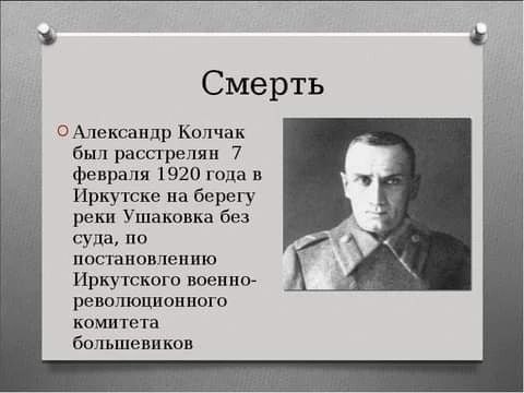 106 лет назад по постановлению Иркутского ВРК был расстрелян "Верховный правитель России" адмирал Александр Васильевич Колчак (4 [16] ноября 1874— 7 февраля 1920).