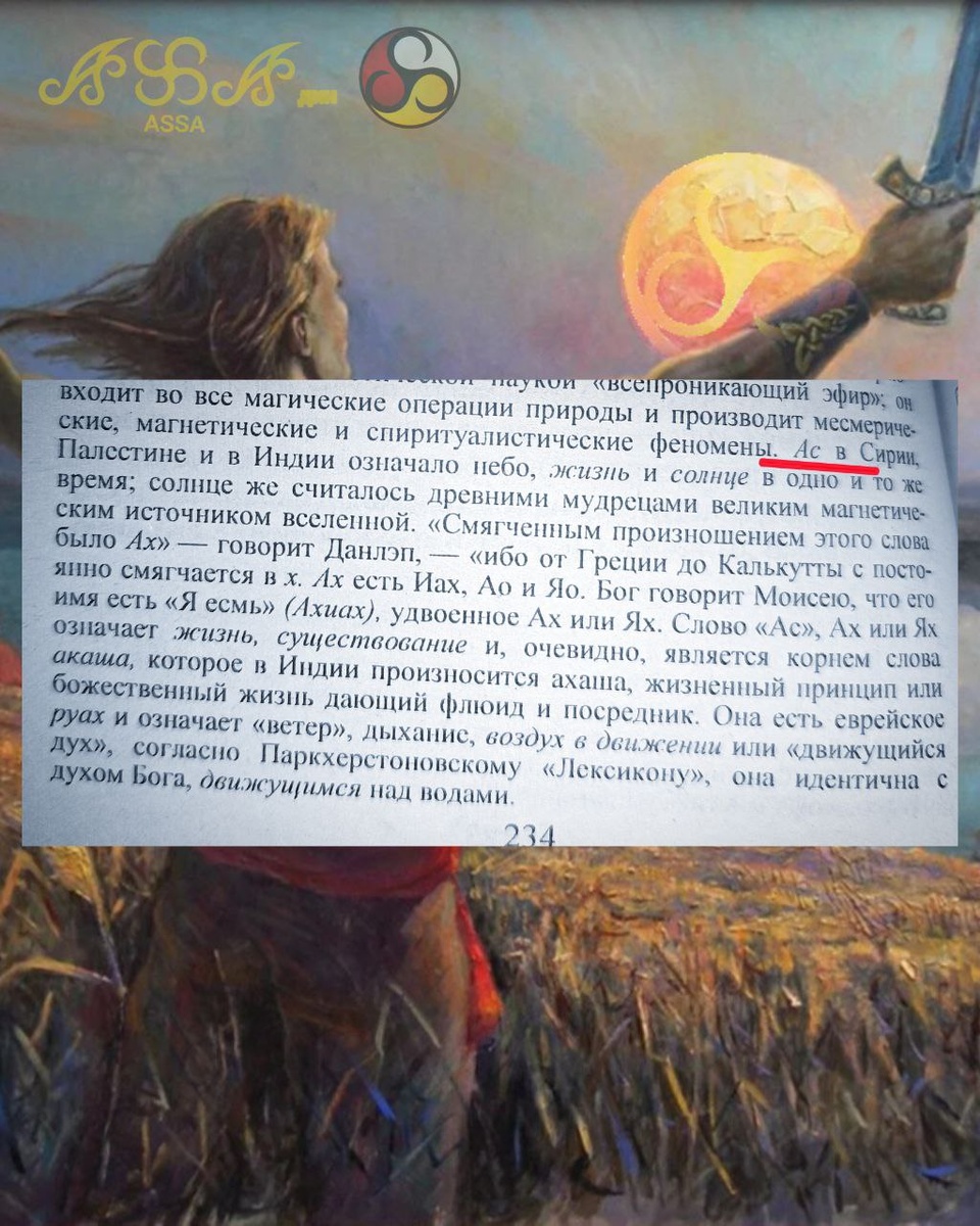 ". Е. Блаватская. Как и говорил в своих исследованиях и открытиях, что Аз/Ас/Арт= Солнце/Огонь/СВЕТ(Дух Творца Хуцау)= Солярный символ- главный символ Ариев. В этом источнике подтверждение моего открытия которое я сделал, проведя сравнительный анализ - Самоназвание народа Ассы-Аланы-Арии, с культурой и языком и с солярным символом🔥☀️ В АССА ЯСНЫЕ ИСТИНЫ ЗНАНИЯ- СВЕТ Ариев🔥☀️