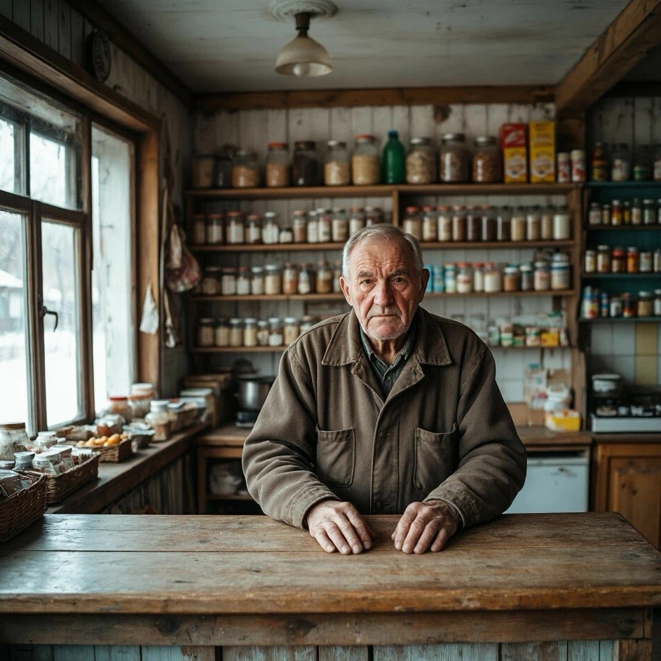 В общих чертах рассказываю ему свою историю. Он вешает на дверь табличку «Обед», закрывает магазин изнутри, включает электрический чайник, достаёт лоток с варёной картошкой, салом, завернутым в фольгу, хрустит маленьким солёным огурцом, радушно предлагает мне угоститься. Я отказываюсь, хотя еда выглядит очень аппетитно.