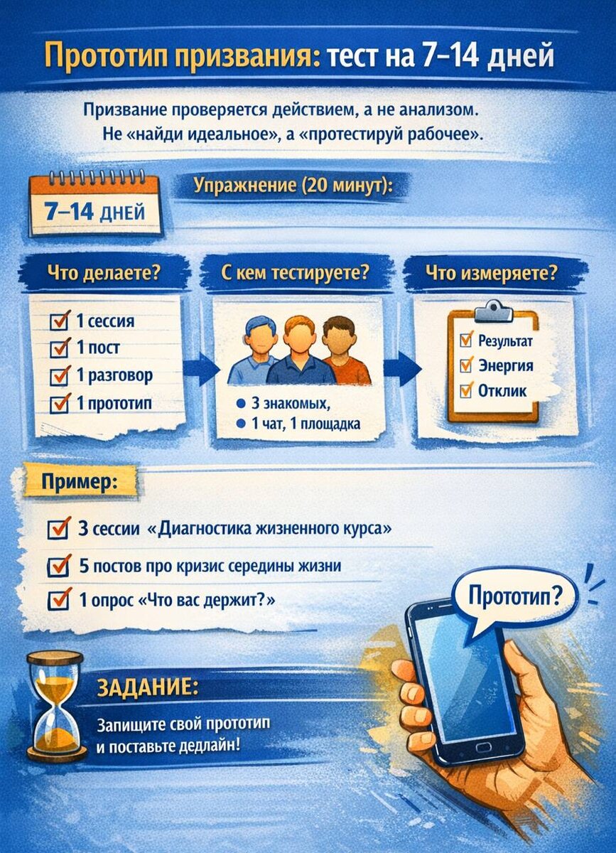 Призвание проверяется действием, а не анализом🔥 Не «найди идеальное», а «протестируй рабочее». Упражнение (20 минут): Возьмите один формат из вчера и создайте микро-прототип на 7–14 дней: 1. Что конкретно делаете: (1 сессия, 1 пост, 1 разговор, 1 прототип услуги) 2. С кем тестируете: (3 знакомых, 1 чат, 1 площадка) 3. Что измеряете: (получилось ли, была ли энергия, был ли отклик) Пример: ☑️Провести 3 бесплатные 30-минутные сессии «диагностика жизненного курса» ☑️Написать 5 постов про кризис середины жизни ☑️Сделать 1 сторис-опрос «что вас держит?» Задание: Запишите свой прототип и поставьте дедлайн. Напишите мне в личку слово «прототип» - могу стать одним из ваших первых тестеров.