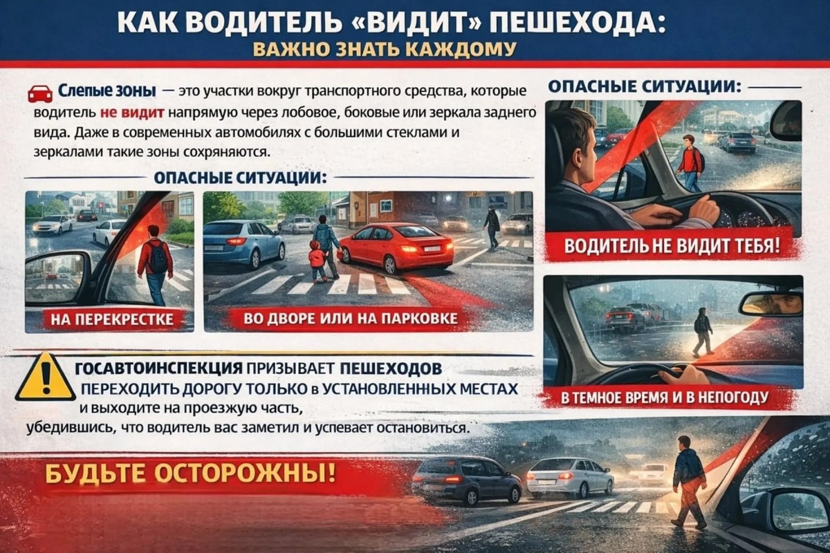 ️⃣ Ты видишь машину — но видит ли она тебя? 🚘 Слепые зоны — это участки вокруг транспортного средства, которые водитель не видит напрямую через лобовое, боковые или зеркала заднего вида. Даже в современных автомобилях с большими стеклами и зеркалами такие зоны сохраняются. Наиболее опасные ситуации возникают: ℹ️ при приближении пешехода сбоку, особенно со стороны правой стойки лобового стекла; ℹ️ при начале движения на перекрестках и пешеходных переходах; ℹ️ во дворах и на парковках, где пешеходы выходят из-за припаркованных автомобилей; ℹ️ в темное время суток и при неблагоприятных погодных условиях. 👀 Если вы видите автомобиль — это не значит, что водитель видит вас На скорости поле зрения водителя сужается. Пешеход, появившийся неожиданно, может быть замечен слишком поздно. ❗️Примерные значения тормозного пути: * при скорости 40 км/ч — около 20 метров; * при скорости 60 км/ч — около 35–40 метров; * при скорости 80 км/ч — более 60 метров. На мокрой, скользкой или заснеженной до