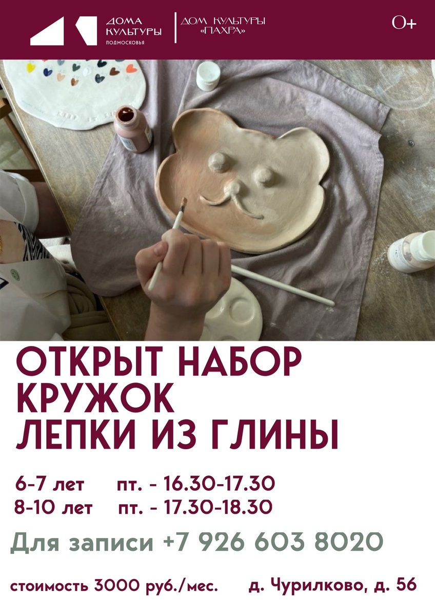 ✨ 🏺 Магия глины: открываем запись в кружок лепки! Ваш ребёнок любит создавать что-то своими руками? Приглашаем юных творцов от 6 лет в мир искусства! Почему это полезно? •Мелкая моторика: работа с мягкой глиной напрямую влияет на развитие центров мозга, отвечающих за речь. •Фантазия: мы не просто лепим, а создаем свои миры, развивая воображение. •Усидчивость: глина учит терпению и концентрации. ✨ Подарите ребёнку радость творчества и гармоничное развитие! Каждую пятницу. Для записи звонить по телефону +7 926 603 8020 Коровицына Александра Евгеньевна. 🚫 Возраст: 6+ 🏢 Сельский дом культуры (СДК) «Пахра» 📍 г.о.Домодедово, дер.Чурилково, ул.Чурилково, д.5Б ✅ Мероприятия Домодедово https://dzen.ru/id/66f10385cc4c5a16f7b5fb02 http://vk.com/domodedovo_events http://dzen.ru/domodedovo_events