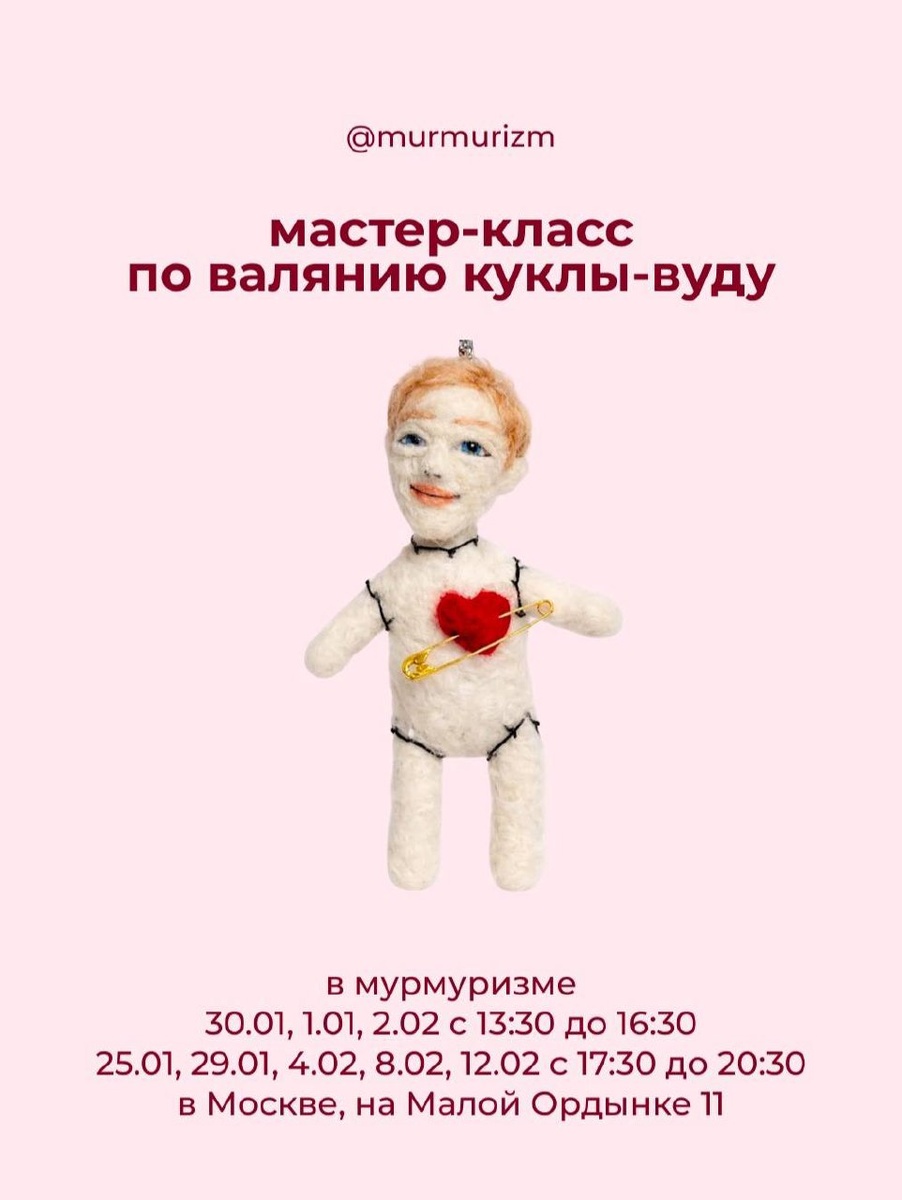 ? Мурмуризм устраивает мастер-классы по созданию кукол вуду из шерсти по фотке вашего бывшего или любого другого персонажа. Предупреждают, что мк шуточный — только арт-терапия и никакой чёрной магии. Ну что, расчехляем фотки бывших? 😏 💰 2780₽ 📌 Малая Ордынка, 11 больше интересного в Москве ❤️
