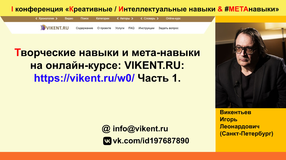 Уважаемые Читатели! Публикуем для Вас видеозапись Доклада с I-й онлайн-конференции «Интеллектуальные / Креативные навыки & #Метанавыки», прошедшей 25 января 2026 года. Викентьев Игорь Леонардович | ТВОРЧЕСКИЕ НАВЫКИ И МЕТА-НАВЫКИ на ОНЛАЙН-КУРСЕ: VIKENT.RU ССЫЛКА на ВК видео: