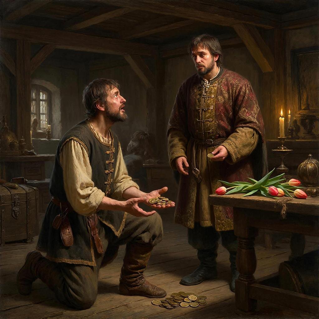 - Богатый купец сидел на мешке с физическими луковицами, которые теперь не стоили и сотой доли от заплаченного.