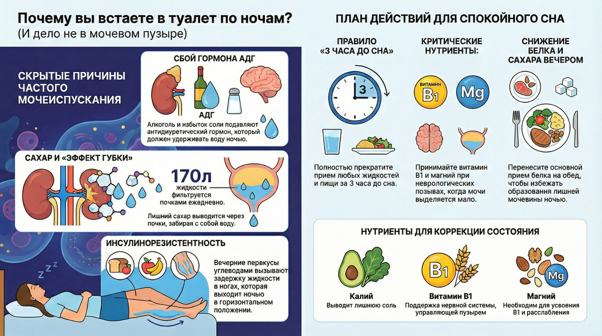 Дело не в возрасте и не в мочевом пузыре. Если вы каждую ночь приходите в туалет, у вас, вероятно, в этом возрасте будет простату или слабый мочевой пузырь. Но я хочу вас обрадовать: скорее всего, причина совсем в другом, и ее можно быстро исправить. Главная проблема ночных пробуждений даже не в самом походе в туалет, а в том, что это портит ваш сон. Этот уровень кортизола приводит к инсулинорезистентности, набору висцерального жира и снижению когнитивных способностей. В наших расчетах есть антидиуретический гормон. Его задача — выдержать жидкость ночью, чтобы вы могли спать 8–9 часов, не просыпаясь. Если вы встаете, значит, что-то блокирует этот гормон. Вот основная причина: 1. Высокий инсулин и сахар. Если вы едите много блюд и сахара (особенно на ужин), уровень глюкозы растет. Организм пытается вывести лишний сахар с мочой, вытягивая воду из клеток. Вода следует за сахаром. 2. Дисбаланс электролитов. Избыток при нехватке соли калия вызывает задержку жидкости. Днем, когда вы стоите,