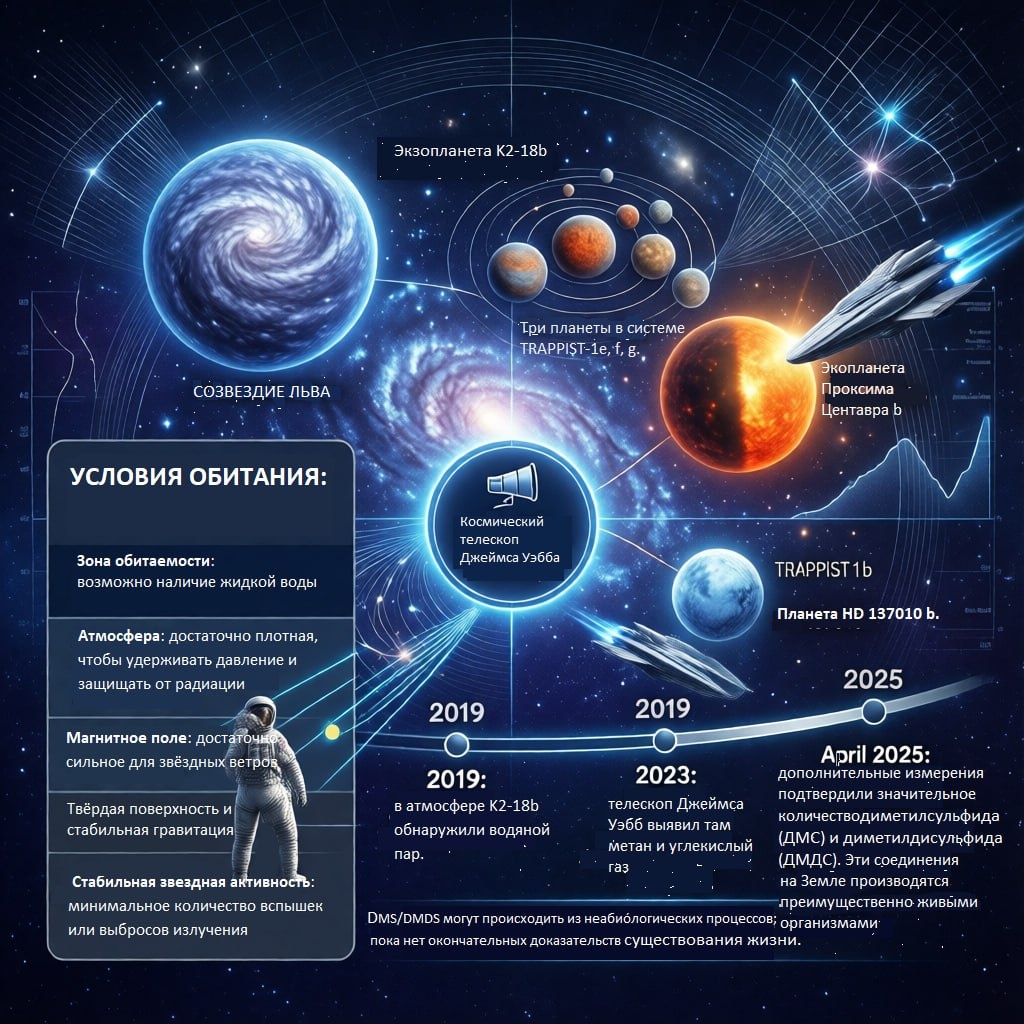 Что уже нашли?🤡 Учёные обнаружили десятки планет, которые потенциально подходят под эти условия. Вот несколько примеров: ✅K2‑18b — там нашли водяной пар и намёки на «пироговые запахи» (газы, которые могут производить живые организмы). Но это пока только намёки — как если бы вы уловили запах пирога, но не уверены, что он настоящий. ✅Проксима Центавра b — ближайшая к нам экзопланета в зоне обитаемости. Но она слишком близко к своей звезде: возможно, на одной стороне адская жара, а на другой — ледяной холод. ✅TRAPPIST‑1e, f, g — три планеты в одной системе, где условия могут быть похожи на земные. Однако их звезда очень активная, и это может мешать жизни. А вдруг жизнь совсем другая?🖥😐 Мы ищем жизнь «по образу и подобию» земной: с водой, кислородом и т. п. Но вдруг где‑то есть существа, которым не нужна вода, а вместо кислорода они дышат… например, аммиаком? Это как если бы вы искали кош