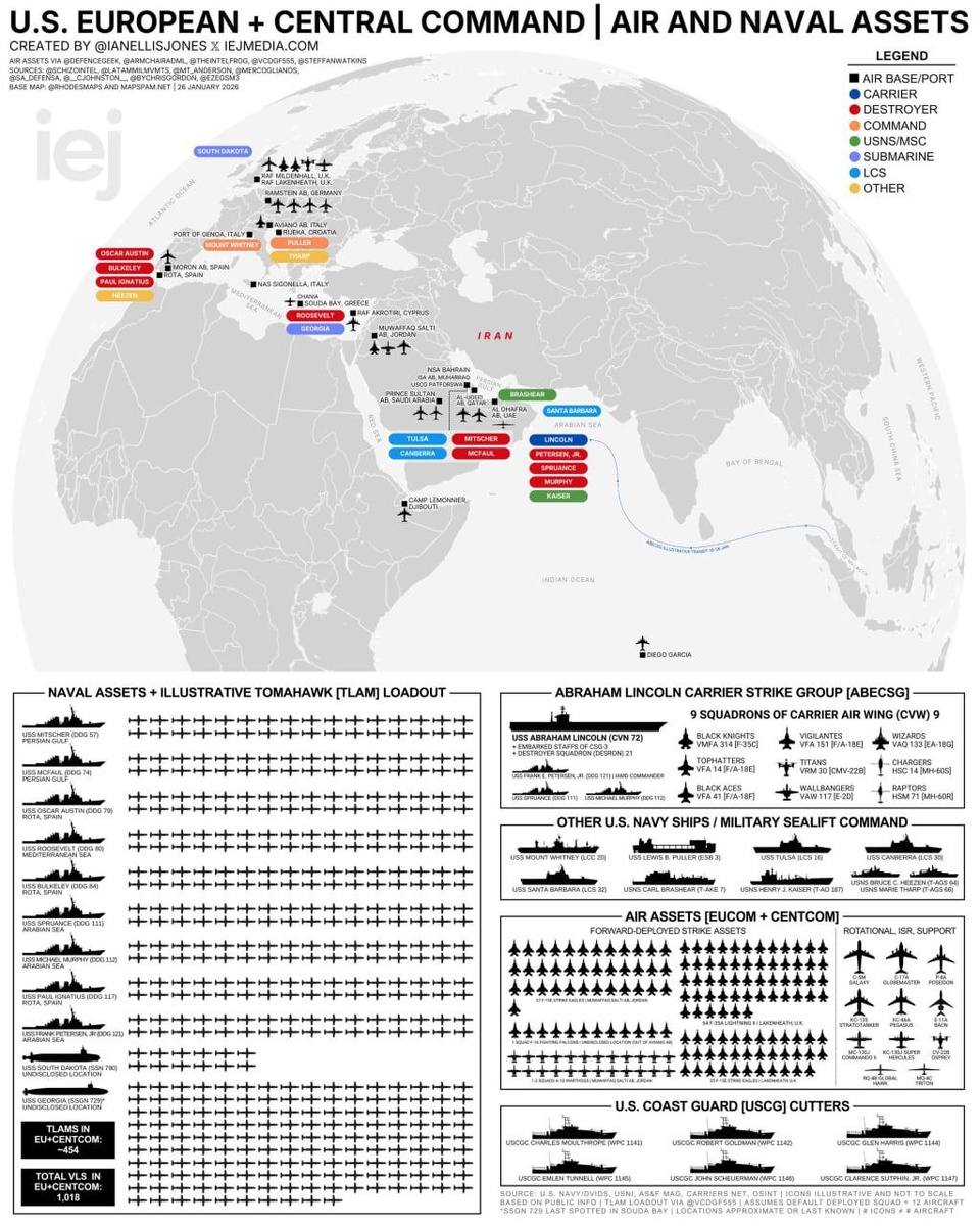 Актуальное количество сил и средств США на Ближнем Востоке, которые могут быть задействованы на иранском театре боевых действий.