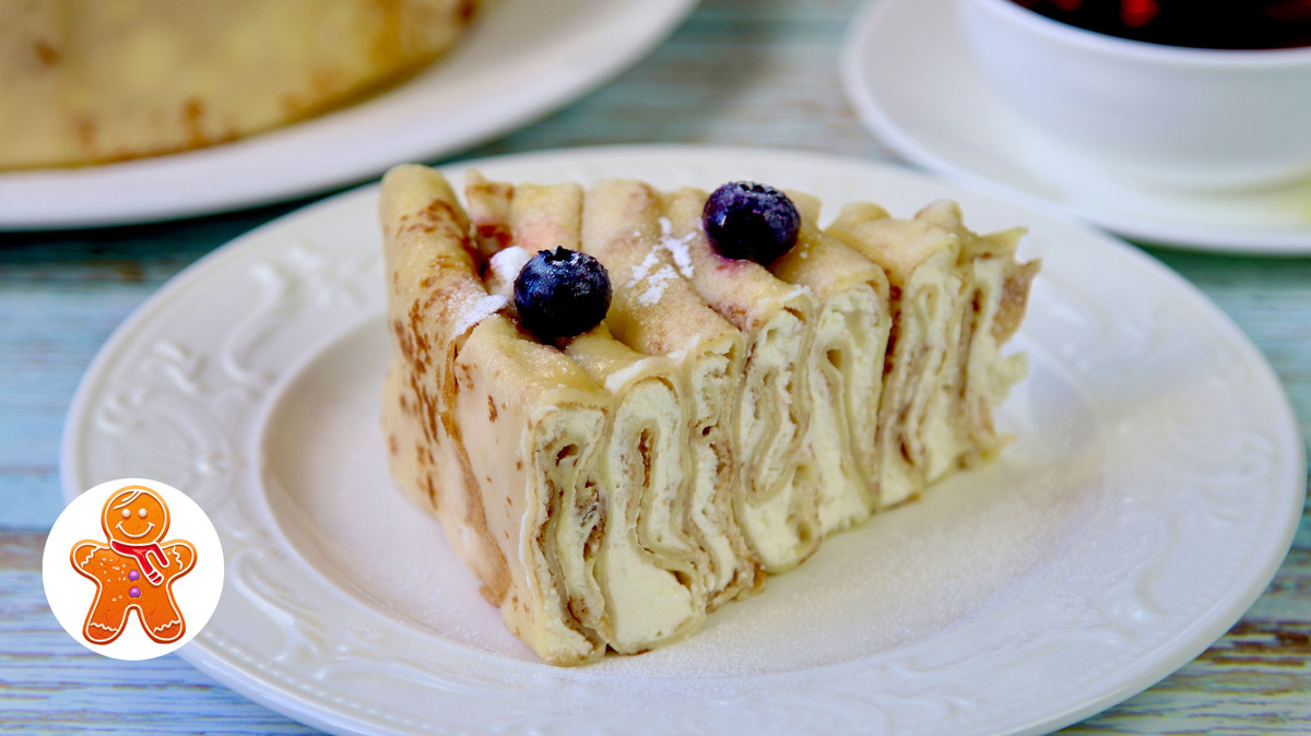 ПРИГОТОВЛЕНИЕ Молоко подогреваем до умеренно горячего. Если мёд густой, засахаренный, то его прогреваем, чтобы мёд стал жидким. Воду доводим до кипения. Муку просеиваем, смешиваем с солью и сахаром. Вбиваем яйца и, постепенно вливая молоко, замешиваем однородное тесто. Вливаем разом весь кипяток, размешиваем. В последнюю очередь вмешиваем в тесто мёд. Тесто получается по консистенции как нежирные сливки. Оставляем тесто на 20 минут настояться. Вмешиваем в тесто растительное масло и печем блины. Из этого количества теста получается 17-18 блинчиков диаметром 20 см. Холодные сливки взбиваем с 1/3 всей сахарной пудры до устойчивого состоян