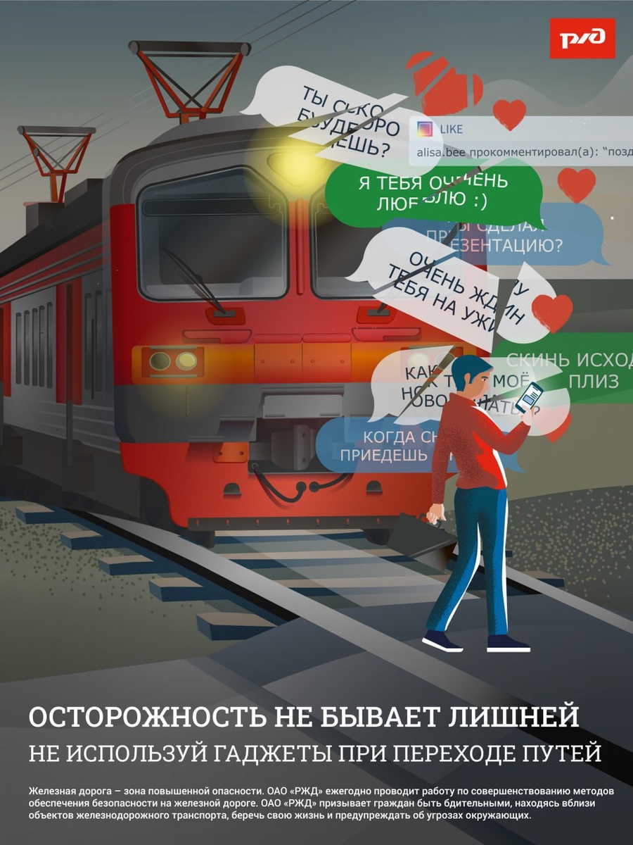 Находясь на них, вы подвергаете свою жизнь риску. Переходить железнодорожные пути можно только в установленных и оборудованных для этого местах, убедившись в отсутствии приближающегося поезда или на разрешающий сигнал переездной сигнализации. Для перехода через железнодорожные пути пользуйтесь пешеходными переходами, мостами, тоннелями. При переходе по пешеходному переходу снимайте наушники и капюшон, они могут помешать вам заметить приближающийся поезд. В целях сохранения своей жизни никогда и ни при каких обстоятельствах: 🔴не подлезайте под пассажирские платформы и подвижной состав; 🔴не прыгайте с пассажирской платформы на пути; 🔴не проходите по железнодорожному переезду при запрещающем сигнале светофора переездной сигнализации независимо от положения и наличия шлагбаума; 🔴не находитесь на объектах железнодорожного транспорта в состоянии алкогольного опьянения; 🔴не поднимайтесь на опоры и специальные конструкции контактной сети, воздушных линий и искусственных сооружений;