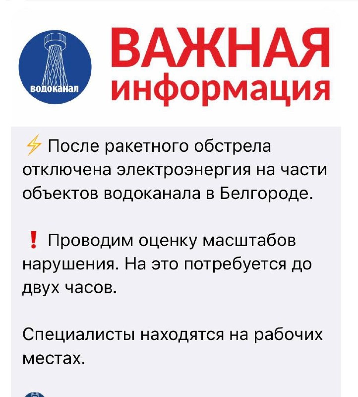 — После ракетного обстрела отключена электроэнергия на части объектов водоканала в Белгороде. Проводим оценку масштабов нарушения. На это потребуется до двух часов, — Водоканал.