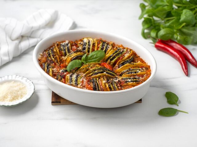 - Выпекайте рататуй примерно 40-50 минут, пока овощи не станут мягкими и слегка подрумянятся.