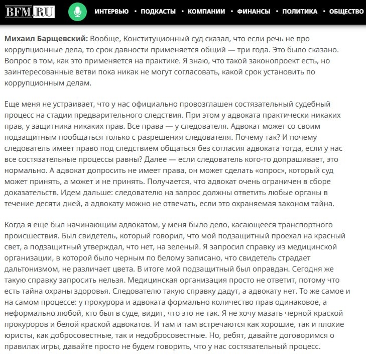 ". При всей противоречивости результата работы Михаила Барщевского (или "что получилось то и цель", как часто пишет Дмитрий Прокофьев?) на должности полпреда Правительства в КС РФ, есть вещи безусловно очевидные #правило_Фуги - состязательности в уголовном процессе нет. А вот в административном процессе на кое-какой прогресс в части состязательности можно рассчитывать. Заявляю об этом опираясь на свой опыт по вот этому делу (УИД 13RS0023-01-2025-003032-79) [2] В этом же интервью [1] Михаил Барщевский признает свою роль в участии по ликвидации Высшего арбитражного. Надо будет отправить ссылку на интервью Роману Бевзенко 🎮. Примечания и ссылки. [1] https://www.bfm.ru/news/597276 [2] По КАС обжалую аннулирование результатов ЕГЭ, но понимаю, что коллеги могут сказать - пример не лучший. Одно дело абитуриент, другое дело бизнесмен, у которого World of Tanks отжали.