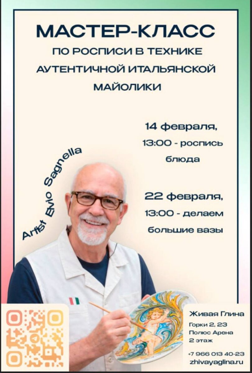 Дорогие! Напоминаем, что к нам приезжает прекрасный художник керамист Эльвио Сагнелла! Работы мастера представлены в Ватикане. Еще есть места. Будем расписывать тарелки, блюда, наносить лепной декор на большие готовые изделия. Этот мастеи класс можно также подарить как подарок своим дорогим и любимым. Это будет не просто обучение, но и чудесное времяпровождение. Не нужно быть художником. Все получится. Угощения, чай, кофе, просеко. 😍🫶