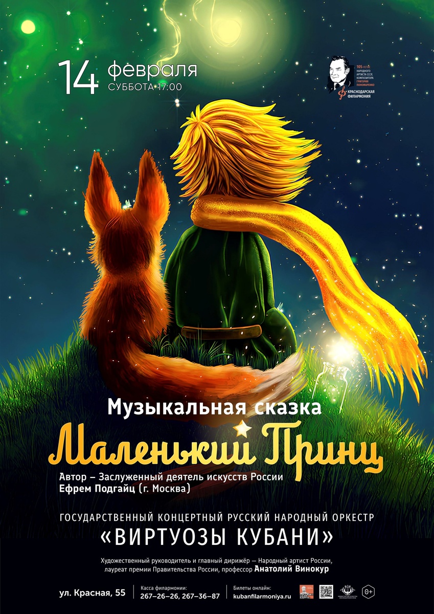 ⭐️ 14 ФЕВРАЛЯ В 17.00 Государственный концертный русский народный оркестр "Виртуозы Кубани" покажет музыкальную сказку «МАЛЕНЬКИЙ ПРИНЦ»💫 Пронзительная и невероятно трогательная история унесет каждого зрителя в мир волшебства. А музыка поможет прочувствовать детскую непосредственность взгляда на мир и глубокую философии жизни, которые отражены в произведении Антуана де Сент-Экзюпери. Совершите фантастические открытия под волнующие звуки оркестра «Виртуозы Кубани»! Маленький Принц навсегда останется в вашем сердце. 📌Билеты можно приобрести в кассе филармонии (ул. Красная, 55) На сайте www.kubanfilarmoniya.ru 🟡 Концерт участвует в проекте «ПУШКИНСКАЯ КАРТА»