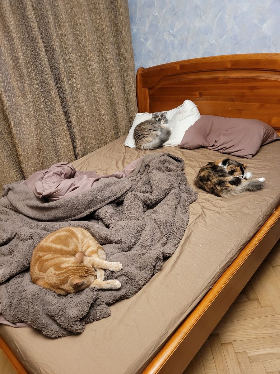 Не кровать, а котодром. На фото Пушуля (мать Принцессы), Ася и Яша (дети Пушули, сестра и брат Принцессы). Первый пост https://pikabu.ru/story/privet_iz_doma_ot_dvukh_kotyat_smertnikov_i_ikh_kotobabushki_asya_yasha_i_pushulya_9055702?utm_source=andlinkshare&utm_medium=sharing