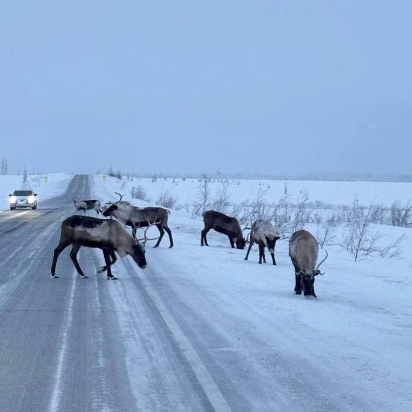 Животные спокойно гуляют прямо по дороге, поэтому водителям стоит быть особенно внимательными и сбавить скорость. Зато есть и приятный бонус – если окажетесь рядом, можно поймать очень красивые кадры северной природы. Только аккуратно и без резких манёвров. • А вы уже встречали оленей на трассе?)
