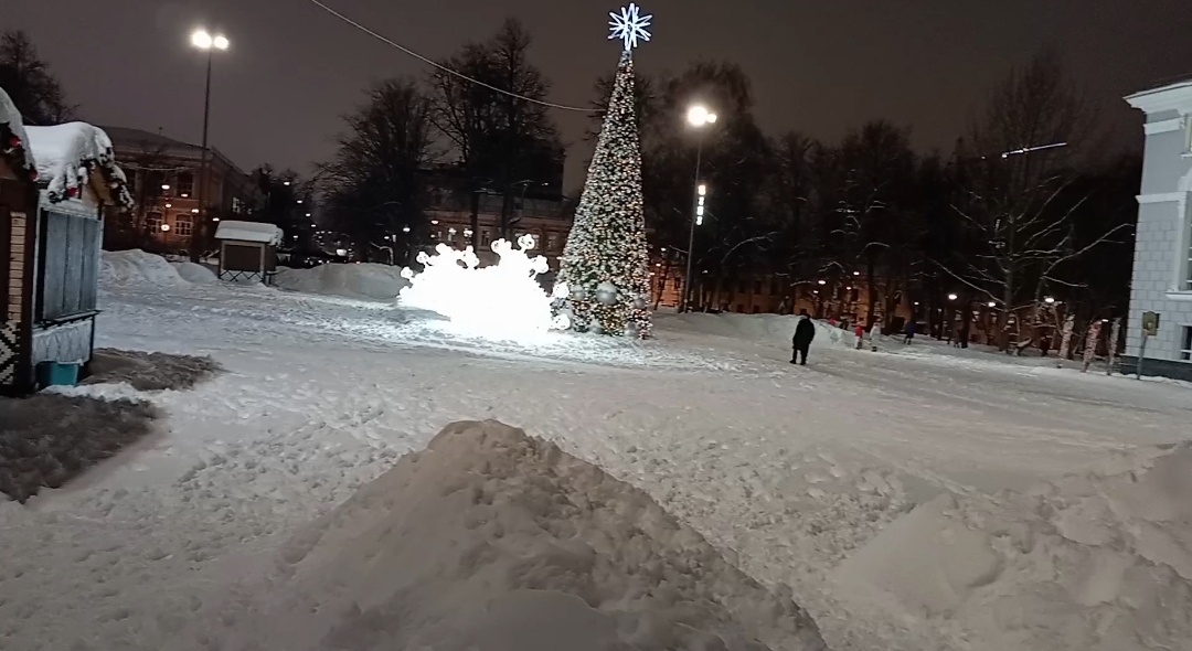 Скромный фонарь, висящий неподалёку от центрального входа в театр, отбрасывает мягкий жёлтый свет, подчёркивая суровую красоту окружающего пейзажа. Его лучи мягко касаются памятника Ленину, стоящего рядом с театром, словно охраняя покой вечнозелёных тенистых аллей, засыпанных пушистым снегом. Статуя Владимира Ильича возвышается величественно и спокойно, словно задумавшись о чём-то далёком и важном, отчего её бронзовый облик кажется ещё более внушительным среди заснеженных пейзажей города.