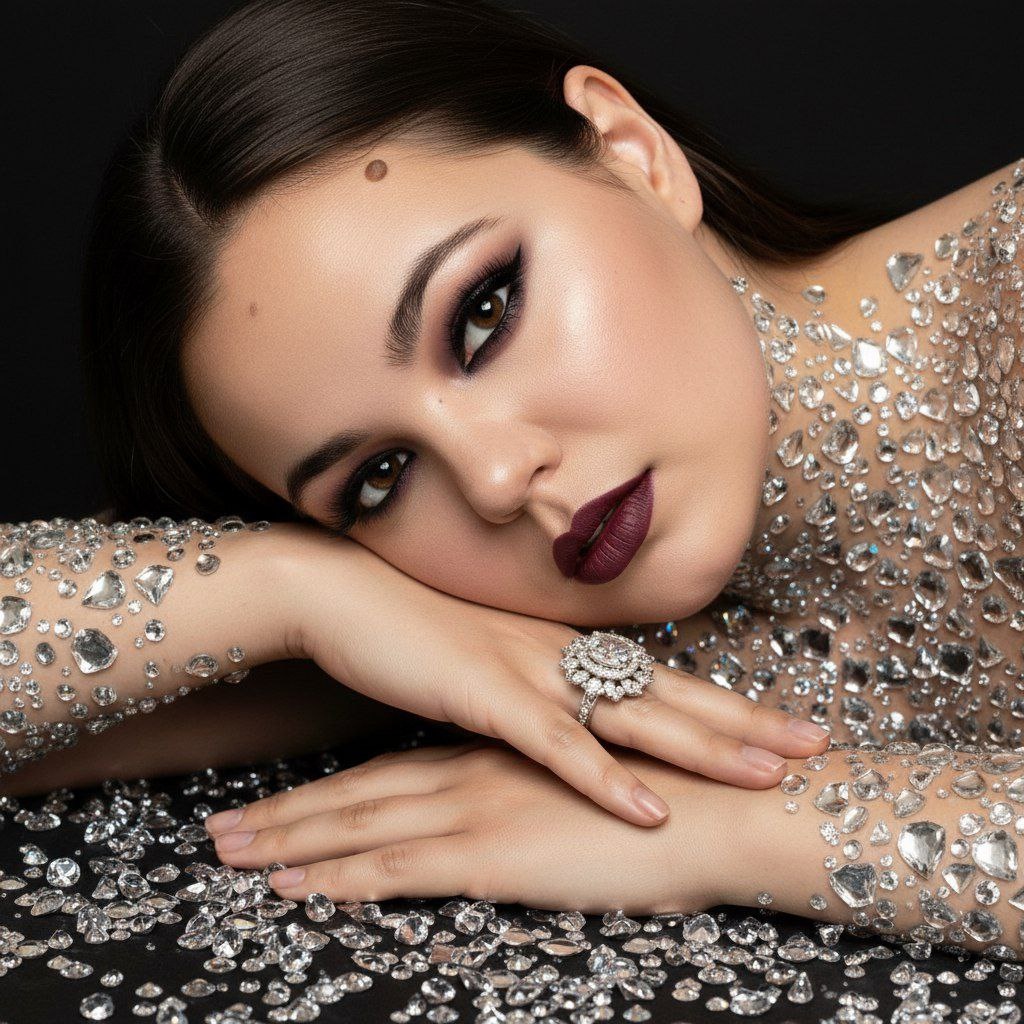 😀Выбираем "нейросети" 😀Нажимаем "Nano Banana" 😀Нажимаем "Nano Banana Pro" 😀Прикрепляем через скрепку свое фото и выбранный промпт 😀Наслаждаемся результатом😍 Используй лицо женщины с загруженного фото. крупный портрет: девушка лежит на боку, опираясь на согнутую руку, голова наклонена и развёрнута к камере, прямой выразительный взгляд. Identity lock — лицо 100% как в референсе, без любых изменений. Кожа с естественным сиянием, подчёркнутые скулы. Макияж: глубокий smoky eyes, длинные ресницы, чёткие брови, матовые винно-бордовые губы. Лицо, шея, плечи и руки густо покрыты кристаллами и стразами разного размера; кисть с массивным бриллиантовым кольцом лежит на поверхности, усыпанной кристаллами. Тёмный фон, мягкий студийный направленный свет, акцент на текстуру кожи и блеск камней. 8K, ultra-sharp, cinematic light, shallow DOF, luxury beauty fashion editorial, фотореализм. #женские@annapromtii20