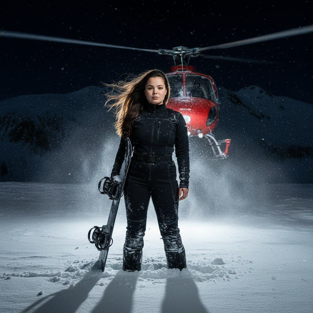 😀Выбираем "нейросети" 😀Нажимаем "Nano Banana" 😀Нажимаем "Nano Banana Pro" 😀Прикрепляем через скрепку свое фото и выбранный промпт 😀Наслаждаемся результатом😍 Используй лицо девушки с загруженного фото. Ультрареалистичное кинематографичное фото в ночных условиях.На переднем плане — молодая женщина стоит на заснеженном горном склоне, кадр по пояс, анфас, взгляд направлен прямо в камеру. Она одета в чёрный зимний сноубордический комбинезон, плотно прилегающий, с множеством следов снега и льда на ткани. Одежда матовая, техническая, с видимыми швами и ремнями. В правой руке она держит чёрный сноуборд, вертикально, край доски частично покрыт снегом. Волосы распущенные, сильно развеваются в сторону из-за мощного потока воздуха. Лицо точно такое как на загруженнлм фото, оно чётко освещено холодным искусственным светом, кожа реалистичная, без сглаживания, естественный макияж, подчёркнутые глаза и губы. Выражение лица уверенное и спокойное. Очень важно не меняй черты лица. На заднем плане