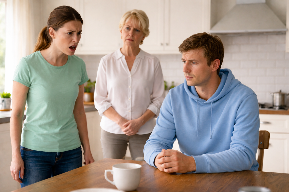 Слова повисли в воздухе кухни, как тяжёлый пар после кипящей кастрюли. Муж сидел за столом, опустив глаза. Перед ним стояла кружка с давно остывшим чаем, и он машинально крутил её ручку, не поднимая головы. Его мать стояла у окна, прижав ладони друг к другу, будто боялась, что если разожмёт пальцы, то рассыплется. В этот момент она выглядела не матерью, не взрослой женщиной, а человеком, который вдруг понял, что больше никто не собирается его спасать.