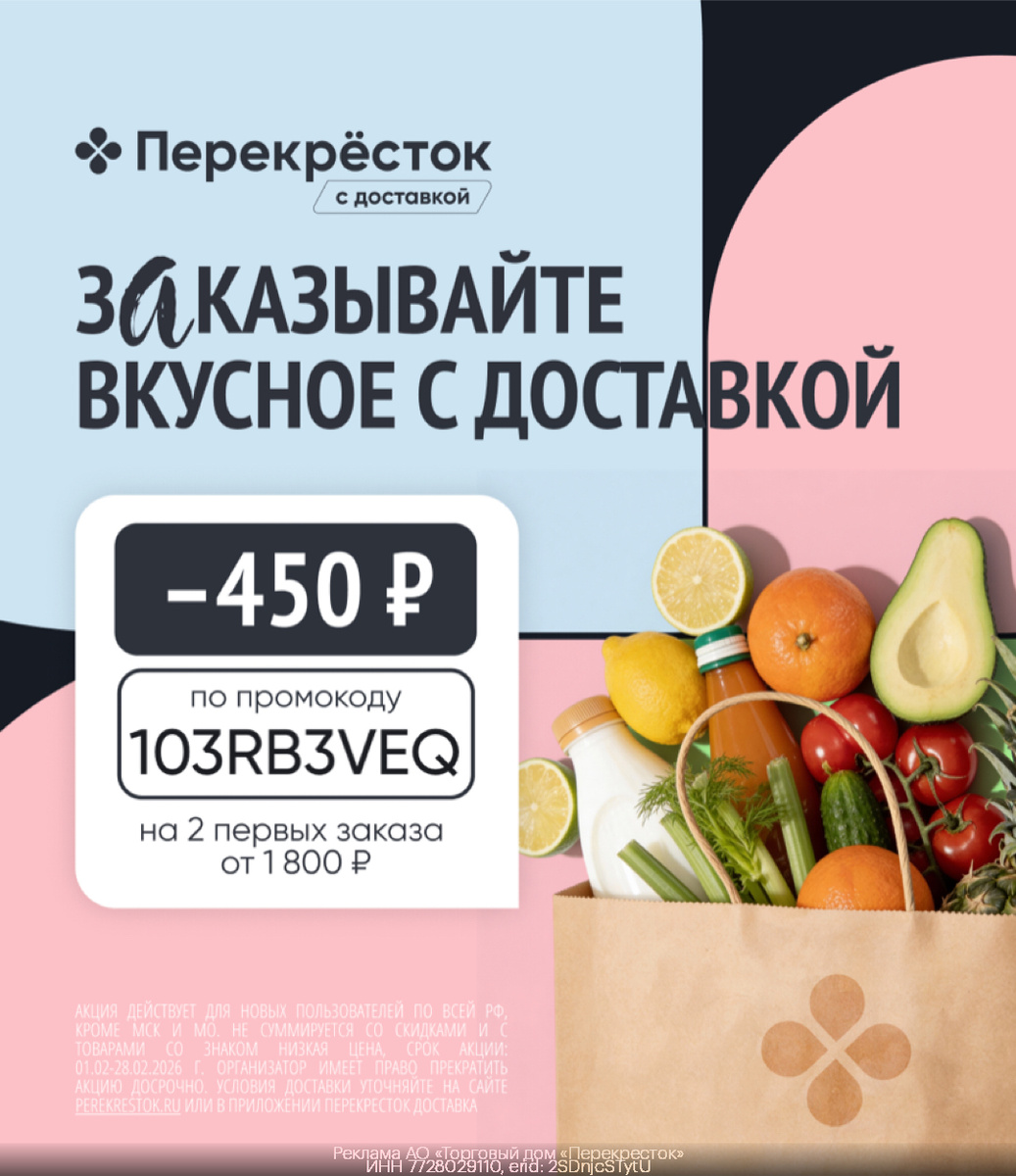 Организатор имеет право прекратить акцию досрочно, условия доставки уточняйте на сайте Perekrestok.ru или в приложении Перекрёсток Доставка.