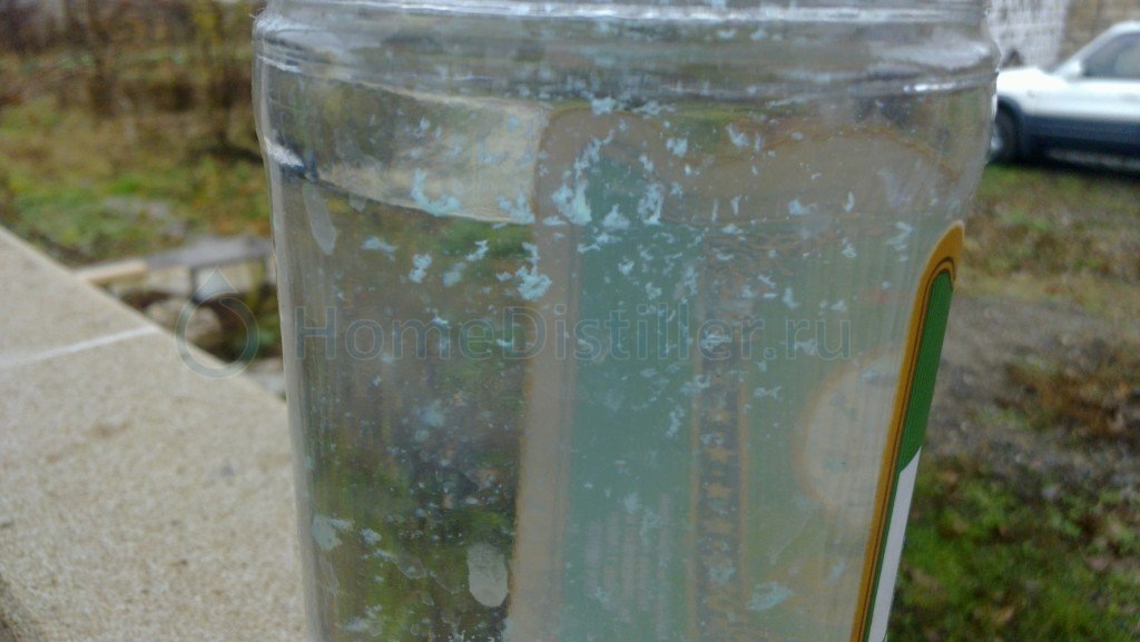 Появление белого налёта или хлопьев в изначально прозрачном самогоне после разбавления или охлаждения — распространённая проблема. Это не всегда признак серьёзного брака, и в большинстве случаев напиток можно спасти. Разберём основные причины и методы их устранения. В чём суть: При разбавлении дистиллята водой с высоким содержанием солей кальция и магния эти соли выпадают в нерастворимый осадок. Обратите внимание: жёсткость воды, использованной для браги, не так критична, так как в процессе перегонки она дистиллируется. Как проявляется: Хлопья или мутный налёт появляются через 2–3 недели после разбавления. Осадок имеет кристаллическую структуру. Решение: В чём суть: При отборе дистиллята до слишком низкой крепости (ниже 40% об.) в самогон попадает повышенное количество сивушных масел. Сразу после перегонки напиток может быть прозрачным, но при охлаждении (до +5...+6°C) или хранении более 12 часов масла выпадают в осадок. Как проявляется: Осадок выглядит как «пушистые», снегоподобные хл