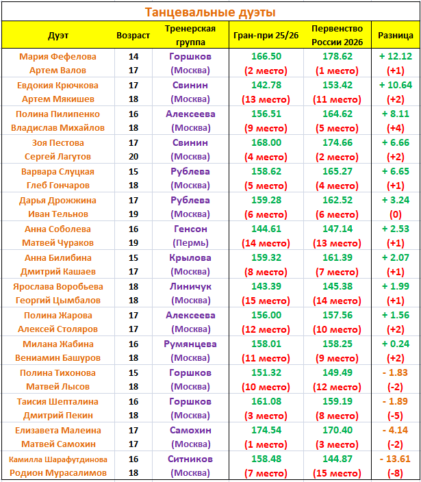 Пояснения к табличкам ниже. В столбцах Гран-при 25/26 и Первенство России 2026 обозначены итоги выступлений участников на этих турнирах (лучшая сумма баллов и занятое место), а в столбце Разница мы видим сравнение результатов фигуристов на Первенстве России относительно этапов Гран-при (плюс - участник выступил лучше, минус - участник выступил хуже). Расположение фигуристов в табличках соответствует баллам в столбце Разница.