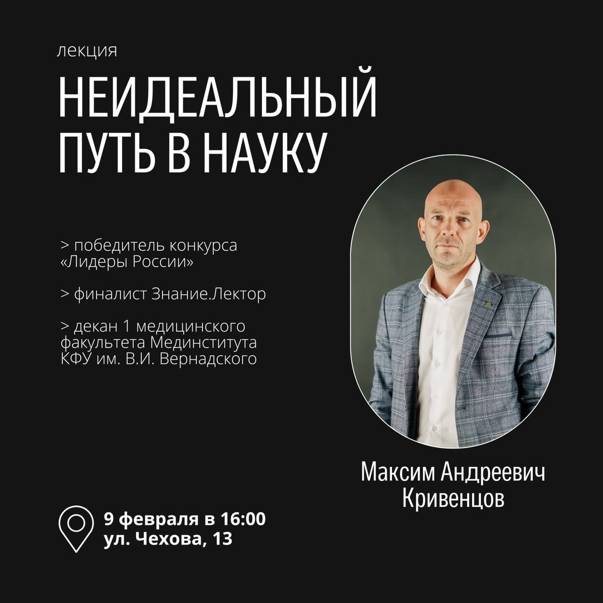 »! Уже 9 февраля состоится первая лекция на тему «Неидеальный путь в науку». Спикер — победитель конкурса «Лидеры России», финалист Знание.Лектор, декан 1 медицинского факультета Мединститута Максим Кривенцов. Вас ждёт реальная история становления исследователя — от первых шагов и сомнений до научных проектов, публикаций и грантовой поддержки. Спикер расскажет о: *️⃣трудностях, отказах и профессиональных кризисах, которые неизбежно сопровождают научную карьеру, но одновременно являются и ключевыми точками роста; *️⃣современных тенденциях и ошеломляющих открытиях в области биомедицинской науки; *️⃣новых возможностях для молодых исследователей. Эта лекция для тех, кто интересуется наукой, профессиональным становлением и поиском собственного трека развития. Помните, путь в науку не обязан быть безошибочным, чтобы быть успешным! Заинтересовались? Скорее регистрируйтесь! 📍 Ждём вас: 9 февраля в 16:00 Симферополь, ул. Чехова, 13 🔔Госкоммол в ВК и МАХ