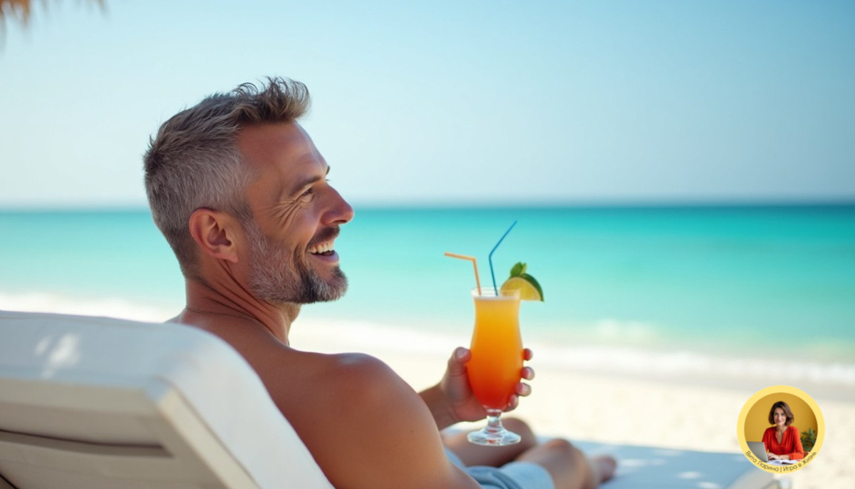 Загорелый, отдохнувший, блеск в глазах. Футболка «Beach Life». Пакет с сувенирами.