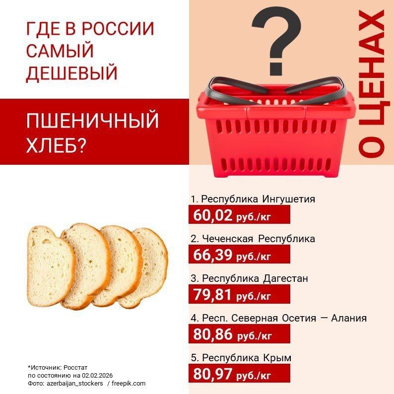 ? Специалисты ФГБУ «Центр агроаналитики» провели исследование цен на базовые продукты и выяснили, в каких регионах россияне могут приобрести пшеничный хлеб и сливочное масло по самым доступным ценам. Лидерами по стоимости белого хлеба стали республики Северного Кавказа: Ингушетия, Чечня, Дагестан и Северная Осетия. Самые низкие цены на килограмм хлебобулочных изделий также зафиксированы в Крыму.