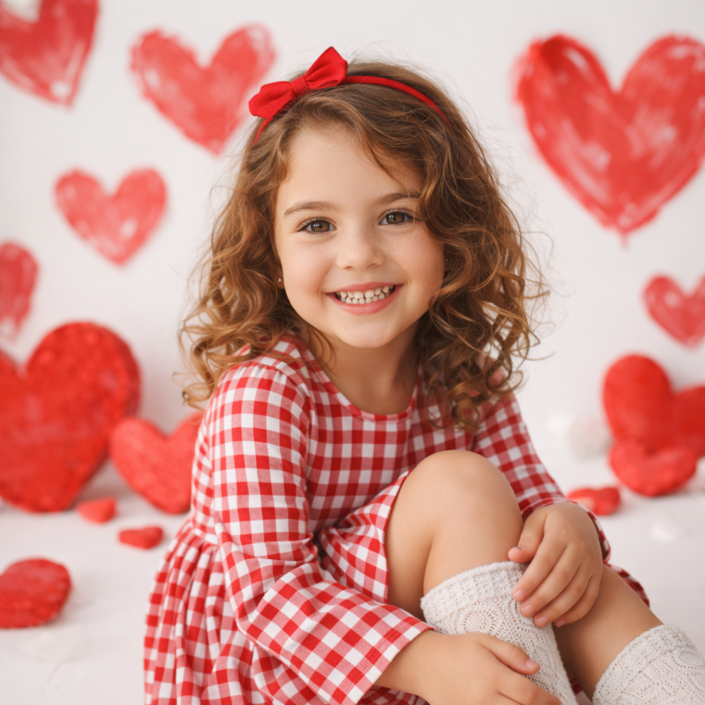 КРИТИЧЕСКИ ВАЖНО: СОХРАНЕНИЕ ЧЕРТ ЛИЦАОБЯЗАТЕЛЬНО сохранить все черты лица с загруженных фотографий:Точная форма лицаРазрез и цвет глазФорма носаФорма губОвал лицаПропорции чертЦвет и текстура кожиВсе индивидуальные особенности внешностиПеренести внешность с фото на новое изображение без изменений!ОСНОВНЫЕ ПАРАМЕТРЫСтиль: Фотореалистичный студийный портретОбъект: Маленькая девочка в расслабленной игривой позеЧерты лица: СТРОГО с загруженных фотографий, без измененийОДЕЖДА И АКСЕССУАРЫКрасно-белое мелко-клетчатое платье с длинными рукавамиБелые вязаные гольфыНебольшой красный бант-ободок в волосахВОЛОСЫСветлые волнистые волосыМягкие локоныДетальная передача прядейКОМПОЗИЦИЯ И ФОНЛокация: Чисто белая студияДекорации:Крупные кистевые красные сердца на стенеКрупные кистевые красные сердца на полуИгривая праздничная композиция в стиле День святого ВалентинаОСВЕЩЕНИЕ И АТМОСФЕРАВысокоключевой мягкий светНатуральные тона кожиЯркие насыщенные красные акцентыМягкие тениЛегкое бокеТЕХНИЧЕСКИЕ ДЕТАЛИФотореалистичный стильТонкая текстура тканиДетальная передача складокВысокое качество детализацииАтмосфера тепла и радостиПОВТОРНОЕ НАПОМИНАНИЕНЕ ИЗМЕНЯТЬ внешность! Использовать ТОЧНЫЕ черты лица с загруженных фотографий!