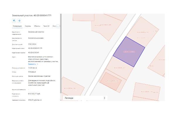Название: Сообщение о возможном предоставлении в аренду земельного участка с кадастровым номером 40:25:000041:771 площадью 1500 кв.м для