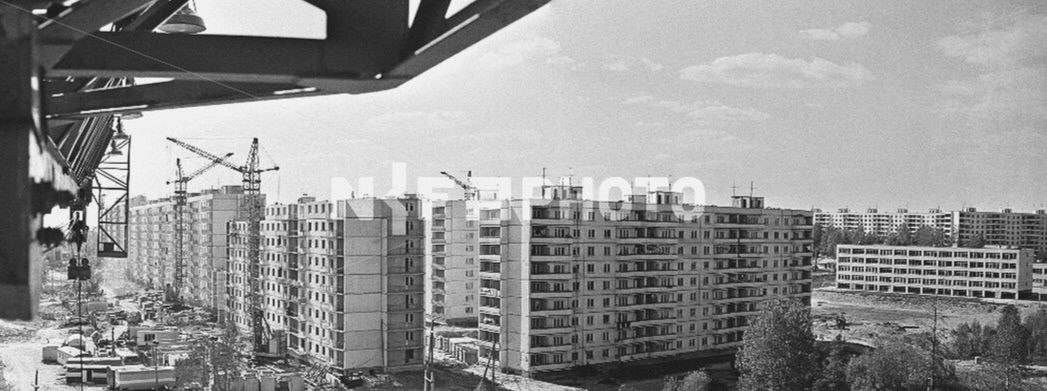 На фотографии 1977 года полным ходом идёт строительство Китайской стены и дома Русская, 29. Русская, 33 уже построен, а справа, из-за построенной 5 лет назад школы № 121 выглядывают Добровольческая, 2 и Тружеников, 9, а вот дома Тружеников, 7 ещё нет, он будет построен совсем скоро, в 1978 году. Фото: Анатолий Поляков