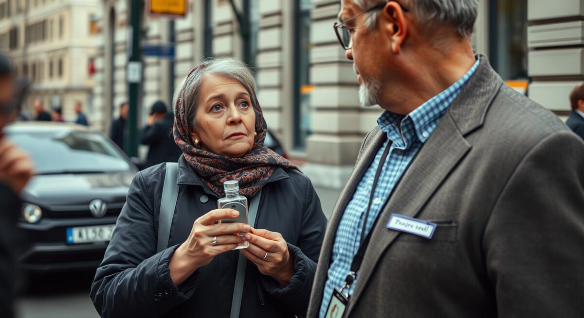 Эпицентр конфликта — именно здесь. Женщина быстро открывает кейс: внутри ряды разноцветных флаконов, на крышечках знакомые названия, бирок много, но чеков и ценников нет. «Давайте на запястье, протестируем, вам пойдёт», — звучит от неё. По словам свидетелей, она уверенно делает пшик на воздух, наклоняется ближе, буквально перехватывая внимание. Мужчина спокойно слушает, кивает, задаёт пару будничных вопросов — откуда товар, есть ли документы, гарантия. «Конечно! Всё честно!» — отвечает она и тянется показать «накладную». И в этот момент он медленно достаёт кошелёк, разворачивает корочку, и в шуме улицы ясно слышно: «Сотрудник… прошу предъявить документы и разрешение на торговлю».