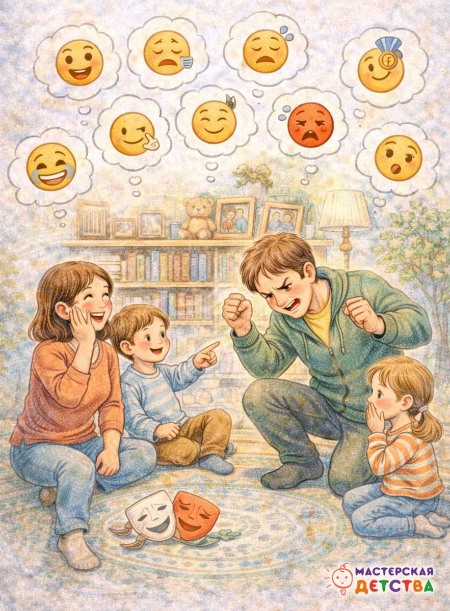 » 🎭 Как играть: 1. Выбираем ведущего. 2. Ведущий загадывает эмоцию молча — без слов и звуков. 3. Показывает её только движением: позой, жестом, походкой. 4. Остальные угадывают, что он сейчас чувствует. Идеи эмоций для старта: — радость, которая не помещается внутри — обида «я не ожидал» — усталость после долгого дня — удивление «вот это да!» — гордость «я смог» — злость, которая уже почти прошла Усложняем (по желанию): — показывать эмоцию в замедленном режиме — показывать одну и ту же эмоцию разными способами — угадывать эмоцию + ситуацию («почему он так двигается?») Почему это классно: — дети учатся читать эмоции не только по словам — взрослые внезапно понимают, как много они выражают телом — много смеха и ноль подготовки 💡 Маленький бонус: после игры можно спросить друг друга — «А какую эмоцию тебе легче всего было показывать?» #МастерскаяДетства