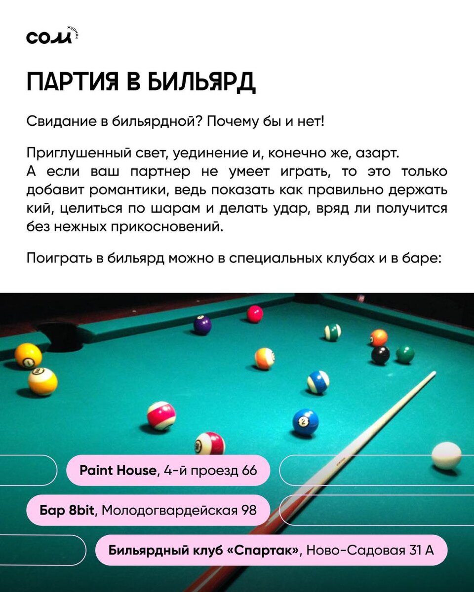 Новый год только слез с наших носов, как на них уже уселся День всех влюбленных! А поэтому пора решать, чем радовать и удивлять своих любимых. Для тех, кто устал от типичных свиданий при свечах, и просто для активных пар мы собрали идеи для свиданий, которые точно запомнятся надолго! Все ссылки на мастерские, стрелковые клубы, картинги, бильярдные, мастерские и собачьи фермы оставили в комментариях к посту! @somsomsom