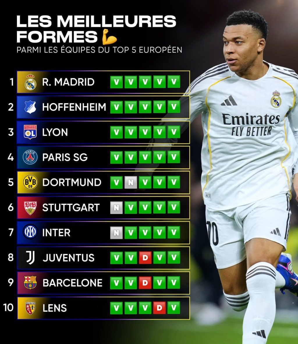 «Реал Мадрид», «Хоффенхайм», «Лион» и «ПСЖ» — единственные клубы из топ-5 лиг Европы, одержавшие 5 побед в 5 последних матчах своих национальных чемпионатов.