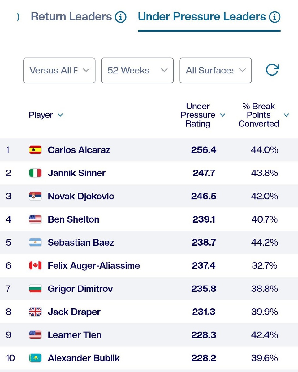 🎾 Бо́льшую часть последних двух лет у Синнера был самый высокий рейтинг "Under Pressure", чему способствовал высокий процент реализации брейк-поинтов в сочетании с лучшим процентом спасения брейк-поинтов. Но реализация 2/18 брейк-поинтов в матче с Джоковичем привела к большому падению его среднего показателя за 52 недели. Это показывает, насколько безумным был полуфинал Джокович - Синнер 🔥 Подпишись на Эйс и точка