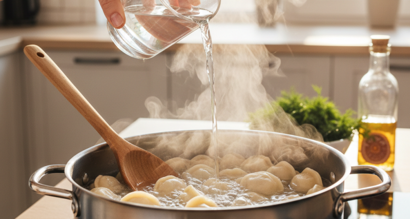 Есть кухонный приём, который часто передают «по наследству»: как только пельмени всплыли и вода снова разошлась бурным кипением, в кастрюлю вливают стакан холодной воды. С виду — странно: мы же только что добились кипения, зачем его гасить? На самом деле это не магия и не «чтобы вкуснее». Это способ управлять температурой и режимом варки, чтобы тесто не рвалось, начинка успевала прогреться, а вода не убегала через край. Пельмени (особенно замороженные) резко охлаждают воду. Кипение на секунды пропадает, затем возвращается — и часто возвращается сразу «в полную силу»: пузырьки бьют по изделиям, пена растёт, тесто начинает активнее отдавать крахмал в воду. Чем сильнее бурление, тем больше механическая нагрузка. Пельмени сталкиваются, бьются о стенки и дно, а тонкие края оболочки испытывают стресс. В итоге самый частый бытовой итог — микротрещины, «расползание» швов и вытекший бульон. Стакан холодной воды на короткое время снижает температуру в кастрюле. Кипение замирает или становится с