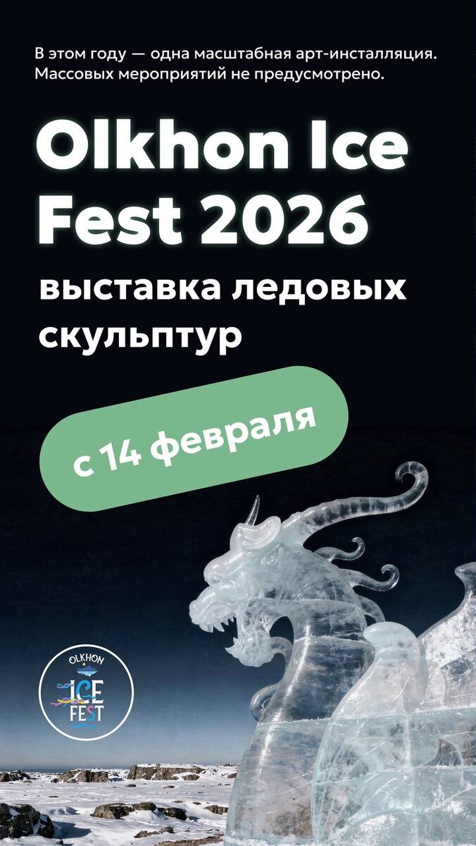 Искусство, которое рождается изо льда — и исчезает, оставляя эмоции. В 2026 году Olkhon Ice Fest будет! Но пройдет в обновлённом формате — будет создана одна масштабная арт-инсталляция. 🔹 Над композицией будут работать 4 скульптора; 🔹 Планируется использовать 30 м³ байкальского льда. 🗓 С 14 февраля Выставка открыта для всех — вход свободный. Приходите в любое время — днём, на закате или вечером, когда включается подсветка и лёд начинает светиться. 📌 Все подробности — в канале фестиваля.