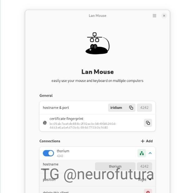 Это стало возможным благодаря удобной программе Lan Mouse. Основные преимущества: * Это open-source альтернатива программам Synergy и Share Mouse. * Поддерживает операционные системы Windows, macOS, Linux (GNOME, KDE, Wayland). * Все данные передаются в зашифрованном виде. * Высокая скорость работы благодаря использованию языка программирования Rust. * Наличие удобного интерфейса, не только консольного. Lan Mouse — отличное решение, если вам нужно управлять рабочим и личным компьютером, ноутбуком и десктопом или несколькими машинами на одном столе. Настроил один раз и можешь забыть о том, что у них разные устройства ввода. Наш телеграмм канал t.me/neurofutura