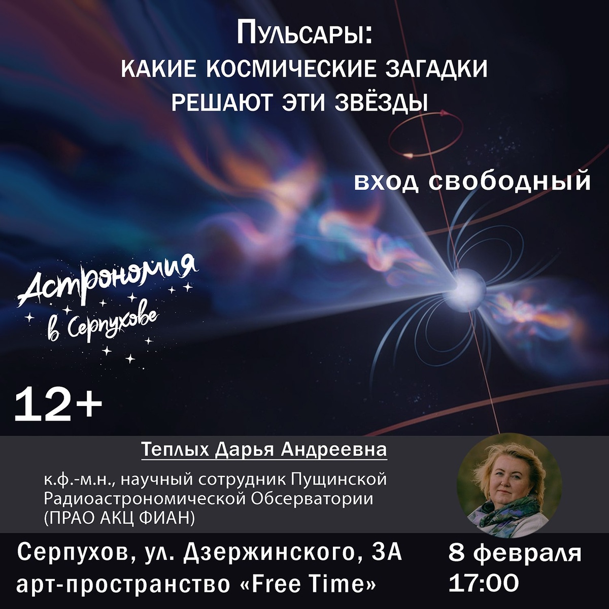 📚Из лекции вы узнаете: — что это за звёзды, почему их так называют — зачем их изучают астрономы и какие тайны космоса они помогают разгадать; ✨Лекцию проводит научный сотрудник Пущинской Радиоастрономической Обсерватории (ПРАО АКЦ ФИАН), к.ф.-м.н. Теплых Дарья Андреевна. 🌔Продолжительность 1,5 часа 🌕Сменная обувь обязательна (можно в своей, можно в тапочках арт-пространства); 💯Приходите! У нас интересно! 🚫 Возраст: 12+ 📆 08.02.2026 🕒 17:00 🏢 Арт-пространство Free time 📍 г. Серпухов, ул. Дзержинского, д. 3А 💰 Вход свободный❗️ ⭐Поддержать канал голосом 💰 Канал Вакансии Серпухова ✅ Мероприятия Серпухов https://dzen.ru/id/66f01c6eb4c6fe60c9ca1608 http://vk.com/serpukhov_events http://dzen.ru/serpukhov_events