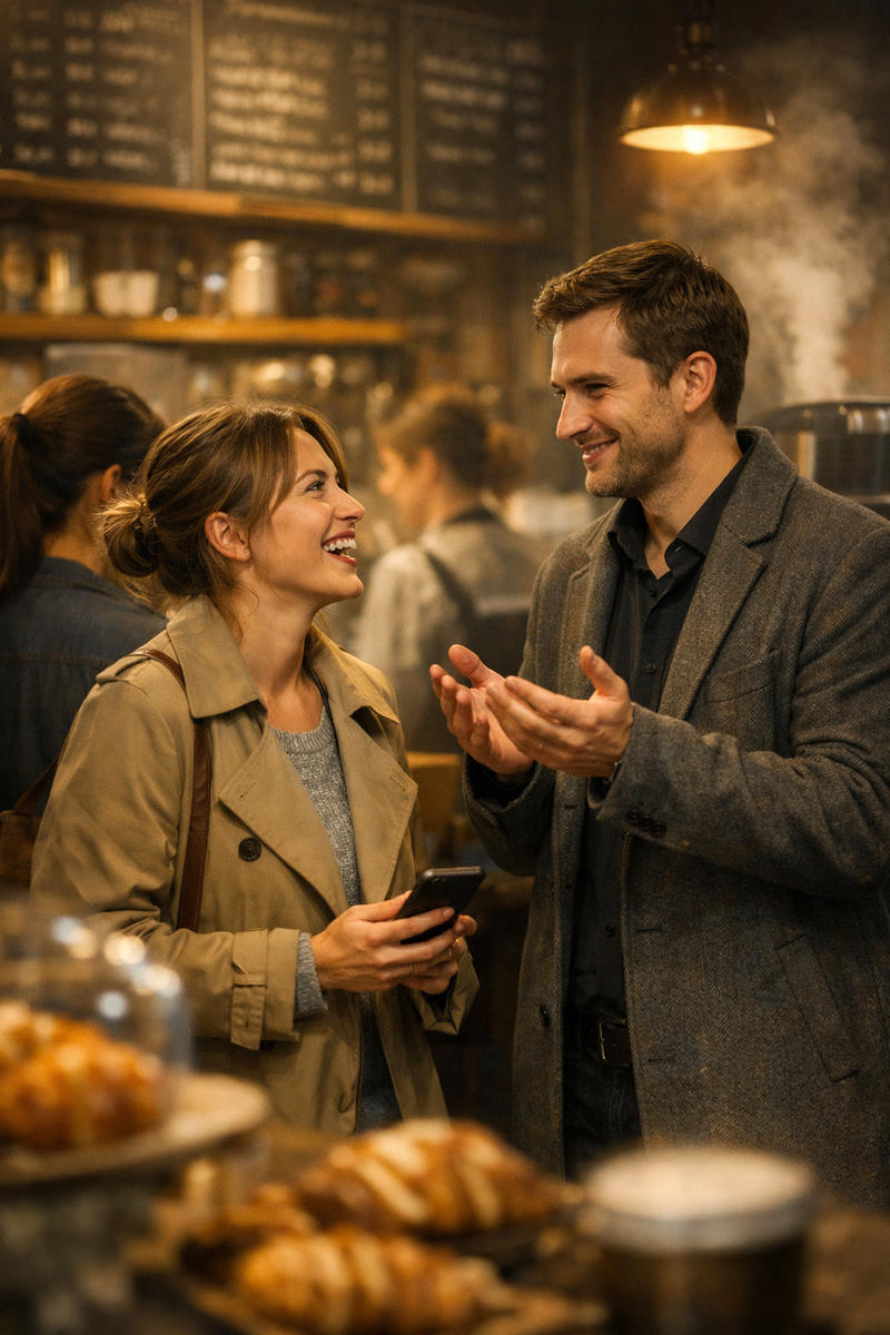 И тут — это его “упала улыбка”. Сказал так просто, будто мы знакомы, будто это у нас семейная шутка. Я подняла голову и увидела мужчину в сером пальто, без этой привычной городской суеты на лице. Глаза внимательные, не липкие. Улыбка не рекламная, а настоящая, чуть неловкая, как у человека, который сам не до конца уверен, что его не пошлют.